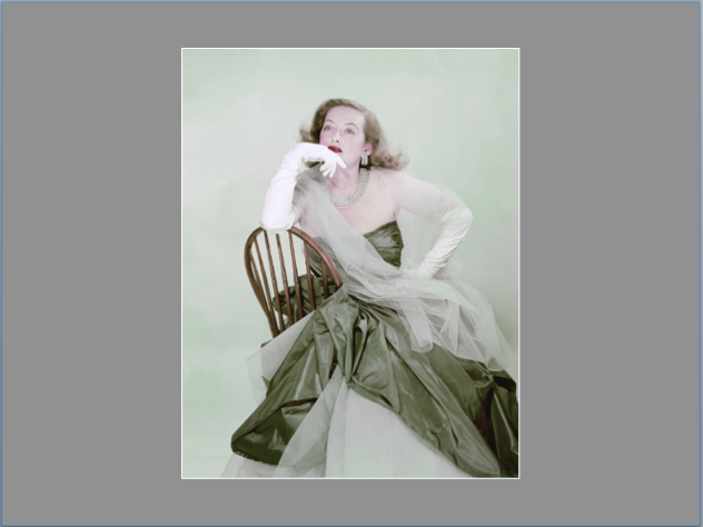 1° maggio 1951. Bette Davis indossa un abito da sera blu-verde senza spalline con stola trasparente, lunghi guanti bianchi, collana di diamanti e orecchini. La fotografia è di Erwin Blumenfeld.